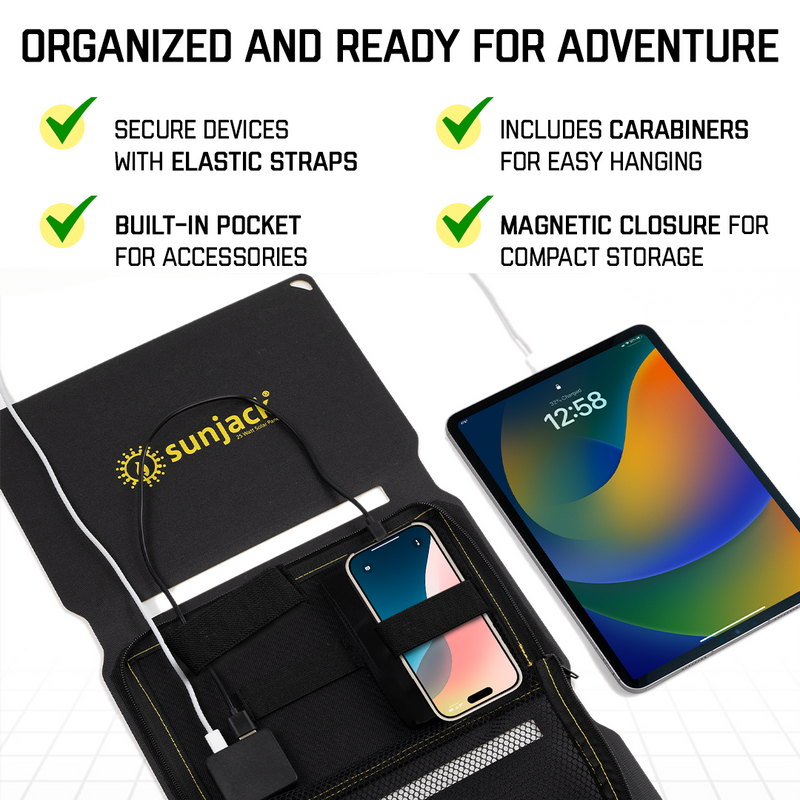 COMPACT & PORTABLE: Panels fold down to the size of a tablet and easily fit into any backpack. Integrated magnetic closure system keeps the panels closed during storage, eliminating the need for bulky straps. Mesh pocket provides ample storage space for most electronics and accessories, while the elastic straps secure phones, power banks and more during storage and transport. The mesh design intuitively allows proper airflow to prevent devices from overheating while being charged.