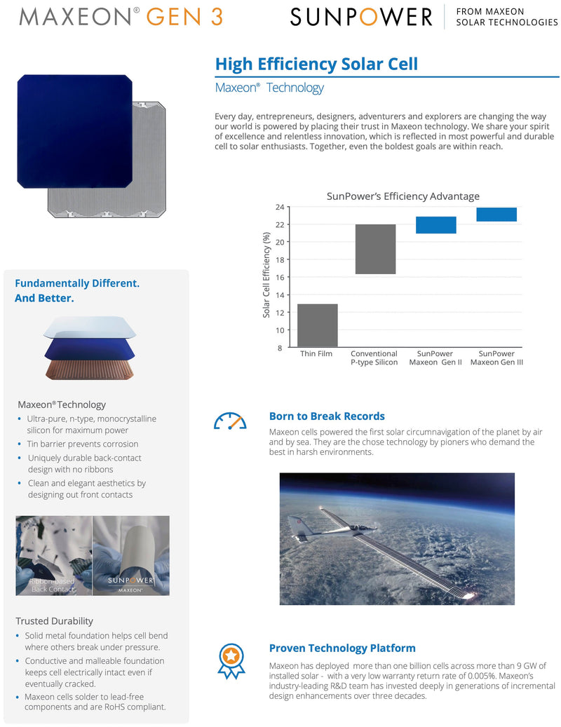 Super light at 7 grams, super thin at 200 microns, flexible up to 15°. Approximately 0.6 volts output per cell, with stable voltages even in overcast conditions. Lowest cell degradation in the industry. Best low light performance