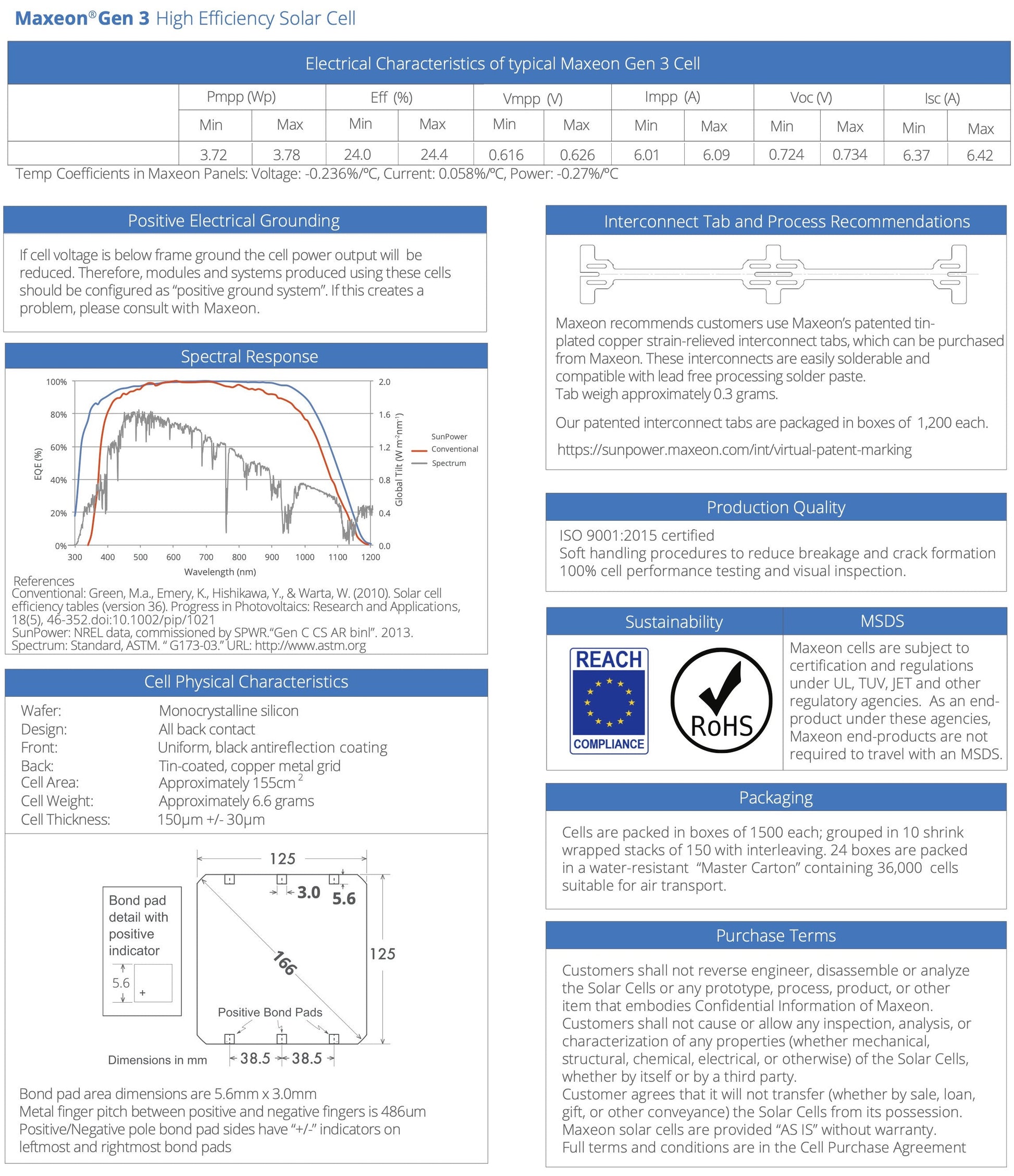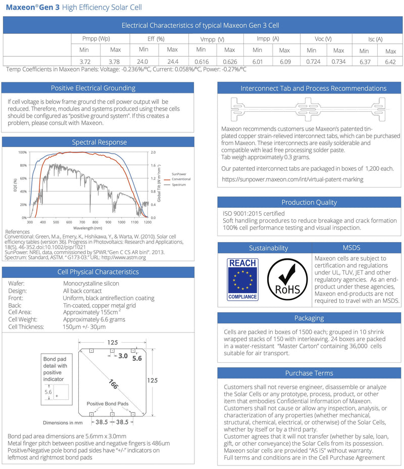 Sunpower 3.6W 0.6V semiflexible Mono Solar Cell (C60, E60, E66 Gen3) (SC)
