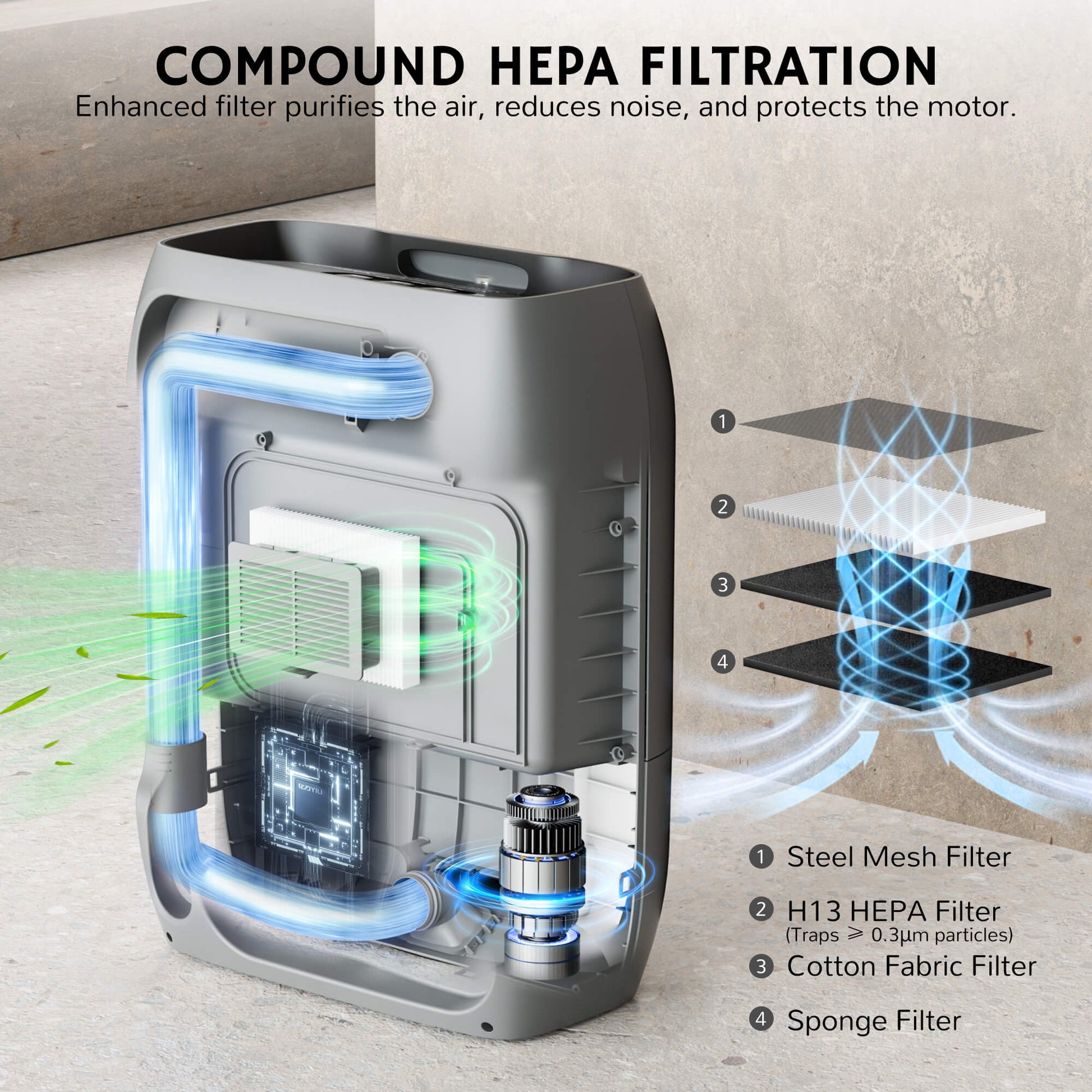 - Fast and Powerful Cleaning: The genuine HEPA filter and activated carbon filter purify the air, capturing particles as small as 0.3 microns. With 20 Kpa suction power, it removes 99.97% of dust, hair, and debris.