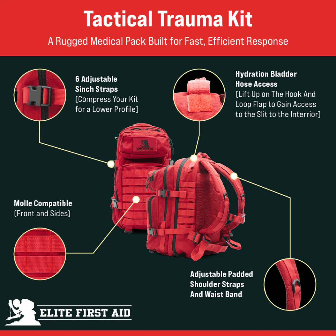 The Tactical Trauma & First Aid Backpack w/Adv Bleeding Control is engineered for high-threat environments and severe trauma, this variant includes life-saving tools such as a windlass tourniquet, hemostatic gauze, and vented chest seals—trusted by law enforcement, EMS, and tactical professionals nationwide.