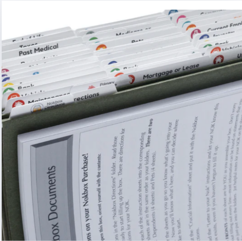 For your NOK, it provides a brief "getting started after someone dies" list, explains how to use the box, and helps them manage keys & secure documents.