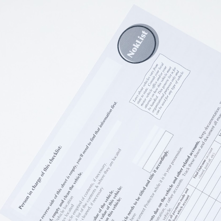 On the back of each sheet, there are instructions for your Next of Kin: The Noklist. These instruct the NOK on what they need to gather, and gives them a place to keep it organized, managed and accounted for.