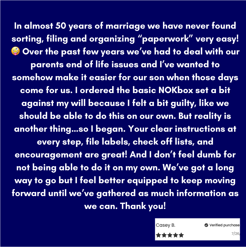 For your NOK, it provides a brief "getting started after someone dies" list, explains how to use the box, and helps them manage keys & secure documents.