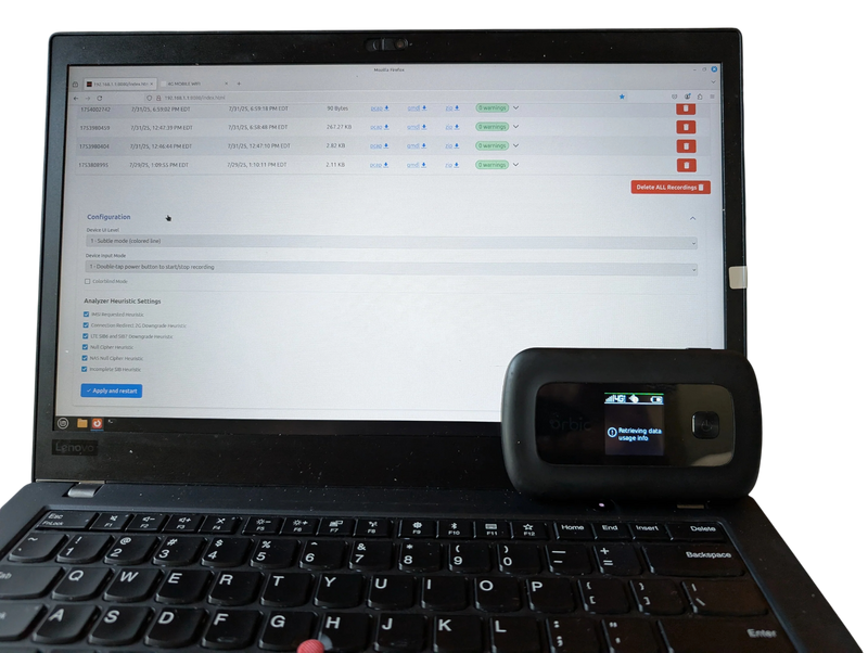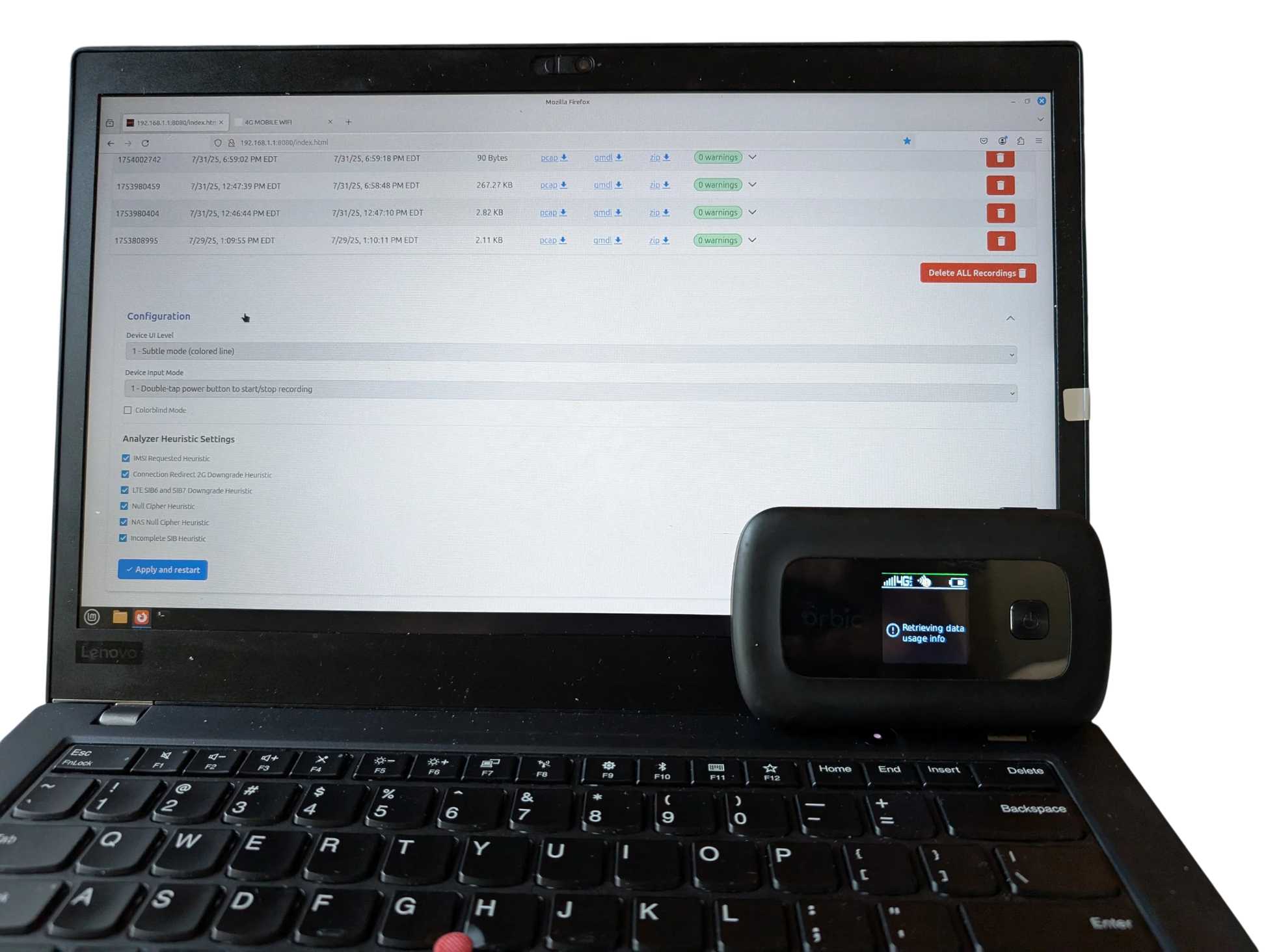 This Orbic RC400L mobile hotspot is professionally pre-installed with RayHunter v0.8.0 (or otherwise latest version), an open-source cellular surveillance detection tool designed to identify: