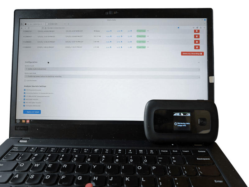 This Orbic RC400L mobile hotspot is professionally pre-installed with RayHunter v0.9.0 (or otherwise latest version), an open-source cellular surveillance detection tool designed to identify:
